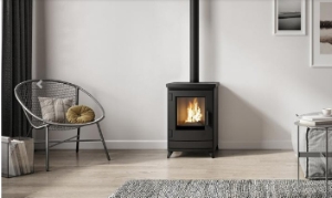 Poêle à pellets "Volcan" de forme ronde au design essentiel et élégant. Côté en acier peint noir, avec top coulissant et porte vitrée Magic.